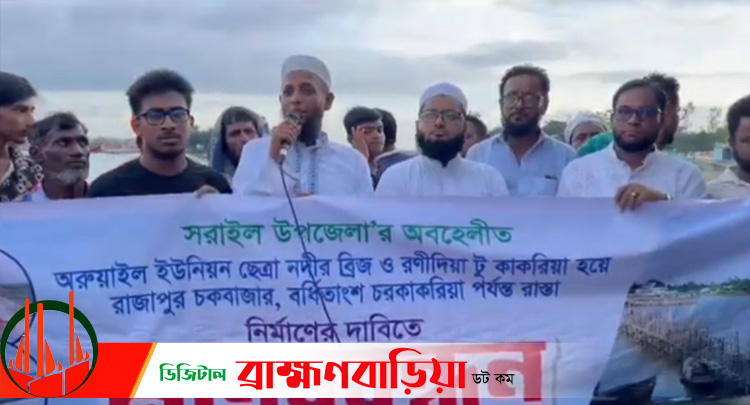 ব্রাহ্মণবাড়িয়ার সরাইল উপজেলার অরুয়াইল ইউনিয়ন ছেত্রা নদীর সেতু নির্মাণ ও রানিদিয়া-কাকরিয়া-রাজাপুর সড়ক নিমাণের দাবিতে মানববন্ধন করেছে অরুয়াইল-পাকশিমুলের আপামর সাধারণ জনগণ। রবিবার বিকালে আয়োজিত মানববন্ধনে স্থানীয় হাজী মোবারক হোসেনের সভাপতিত্বে মানববন্ধনে গ্রামবাসীর দাবীর সাথে একাত্মতা প্রকাশ করেন জাতীয় নাগরিক পার্টি (এনসিপি) যুগ্ম আহ্বায়ক মাওলানা মো. আশরাফ উদ্দিন মাহদি। মানববন্ধনে গ্রামবাসী বলেন, স্বাধীনতার ৫৪ বছর হয়ে গেলেও অরুয়াইল পাকশিমুল ইউনিয়নের জনগণ এই সেতুর অপেক্ষায় আছে। অনেক প্রতিশ্রুতি দিল, কিন্তু এর কোন বাস্তবায়ন নেই। ব্রাহ্মণবাড়িয়ার সরাইলের ছেত্রা নদীর এই বাশের সাকো দিয়ে দুই পাড়ের প্রায় ২০টি গ্রামের লক্ষাধিক মানুষ যাতায়াত করে। নিজেদের অর্থায়নে তৈরী দশ ফুটের একটা বাশের সাকোটি একটু ঝড় তুফানেই ক্ষতিগ্রস্ত হয়। স্থানীয়রা জানান, মা ও বোনেরা জানান, জরুরী অবস্থায় অন্তঃসত্ত্বা নারীদের জন্য এই বাঁশের সাঁকোটি খুবই ঝুঁকিপূর্ণ। অনেক সময় প্রত্যন্ত গ্রামের নারীদের প্রসব বেদনা শুরু হলে এই সাঁকোর ওপর দিয়ে হেঁটে নিয়ে যেতে হয়। এ নদীর ওপর সেতুটি করে দিলে আমাদের চলাচলের অনেক উপকার হবে।