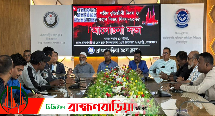 শহীদ বুদ্ধিজীবী দিবস ও মহান বিজয় দিবস উপলক্ষে ব্রাহ্মণবাড়িয়া প্রেসক্লাবে এক আলোচনা সভা অনুষ্ঠিত হয়েছে। সোমবার (১৫ ডিসেম্বর) দুপুরে ক্লাবের
